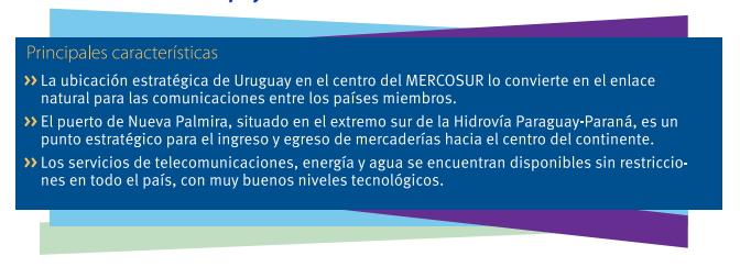 Entre el Mercosur, sus estados asociados y el TLC con México, a través de Uruguay se puede acceder a un mercado de 400 millones de personas, que acumula el 80% del PIB y el 81% del flujo de comercio exterior de América Latina. El país dispone de recursos humanos talentosos y altamente competitivos, gracias a la conjunción de varios factores, entre los que se destacan la alta calidad de la formación básica, técnica y universitaria, la flexibilidad y facilidad de los trabajadores uruguayos de adaptarse a nuevos procesos de producción o tecnologías, y salarios competitivos en la región. Uruguay es el país más equitativo, con menor pobreza y mayor proporción de clase media de Latinoamérica. Esto genera las condiciones que le permiten distinguirse como un lugar amigable tanto para vivir, trabajar e invertir. De hecho, Montevideo donde vive y trabaja más de la mitad de su población es la ciudad de mejor calidad de vida de América Latina, según Mercer (2018).